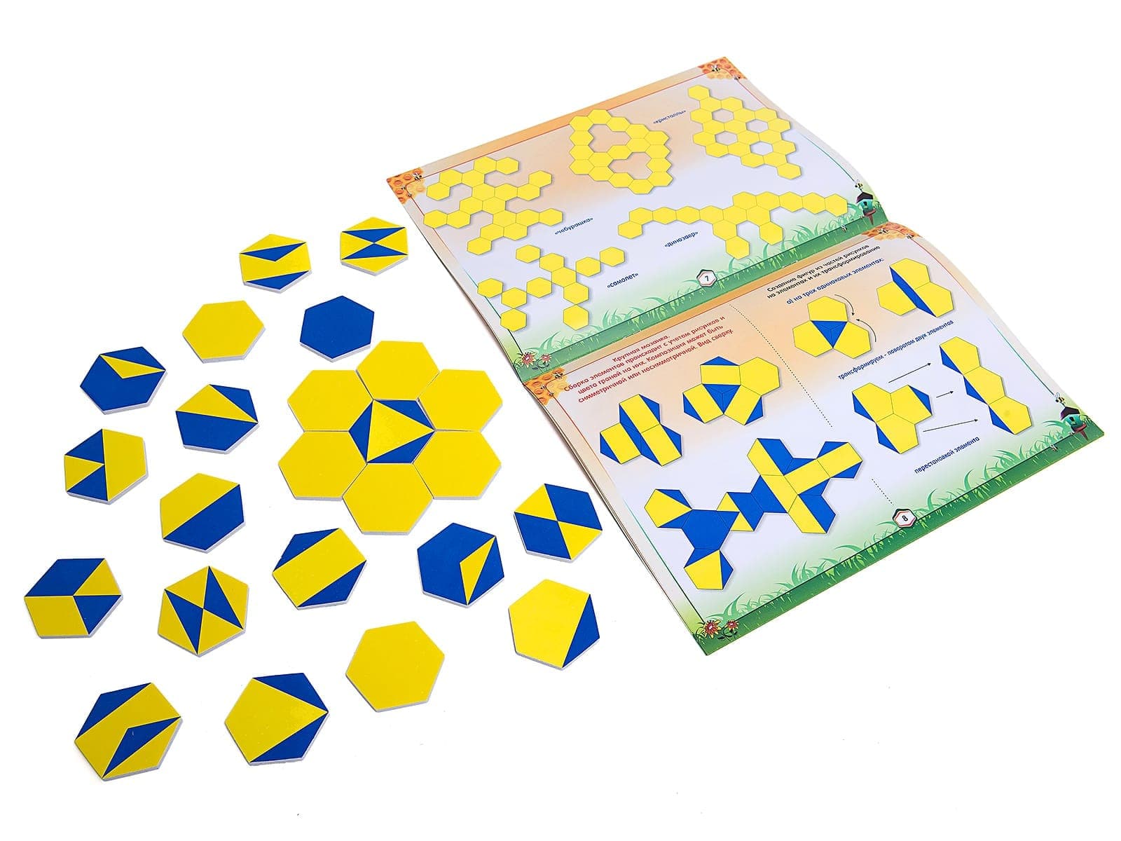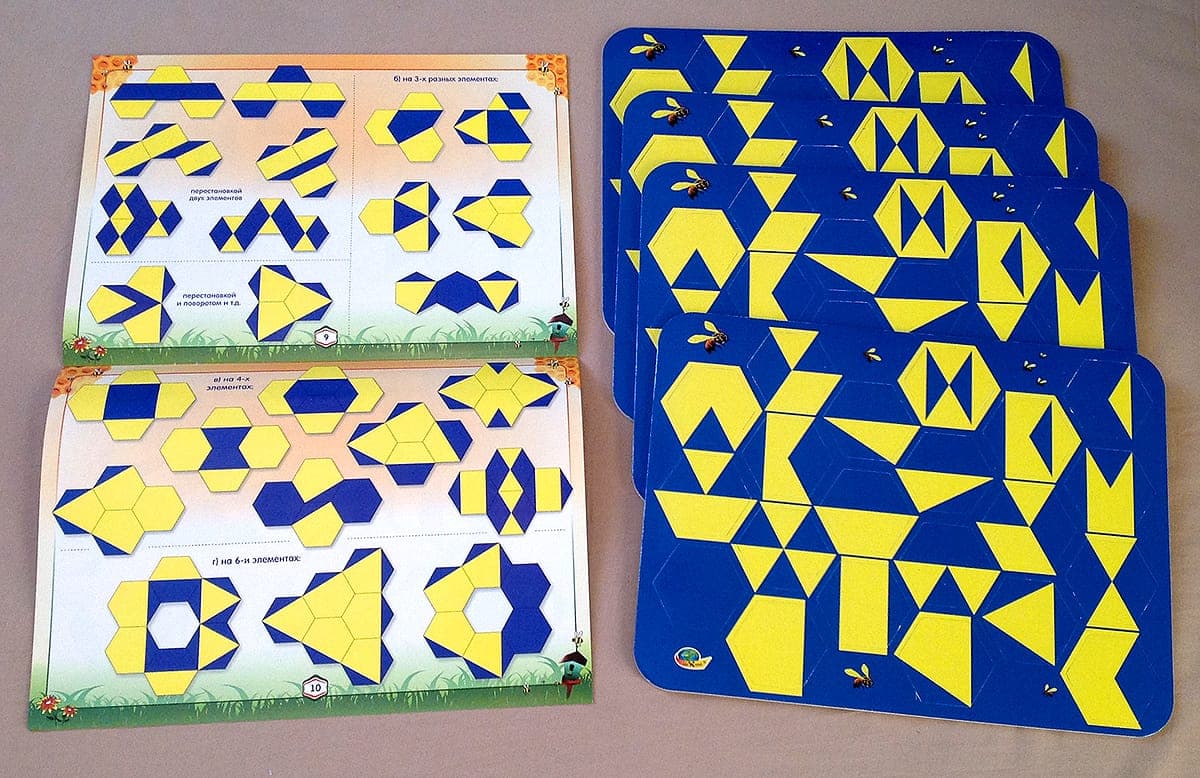 Набор состоит из 84 объемных элементов. Элемент имеет форму шестигранника – 21 вариант рисунков, по 4 штуки каждого. На лицевой стороне – мозаичный рисунок, оборотная сторона – однотонная. Методические рекомендации с вариантами примеров и заданий.